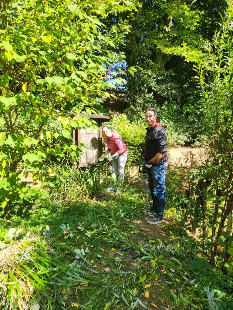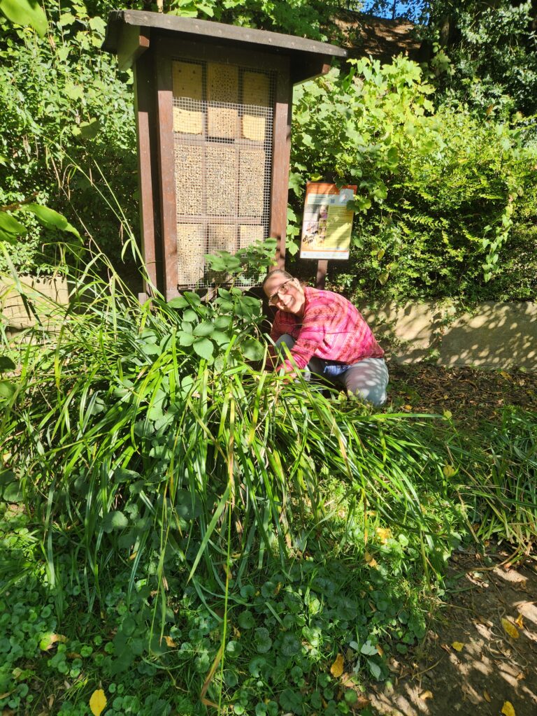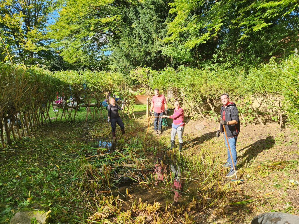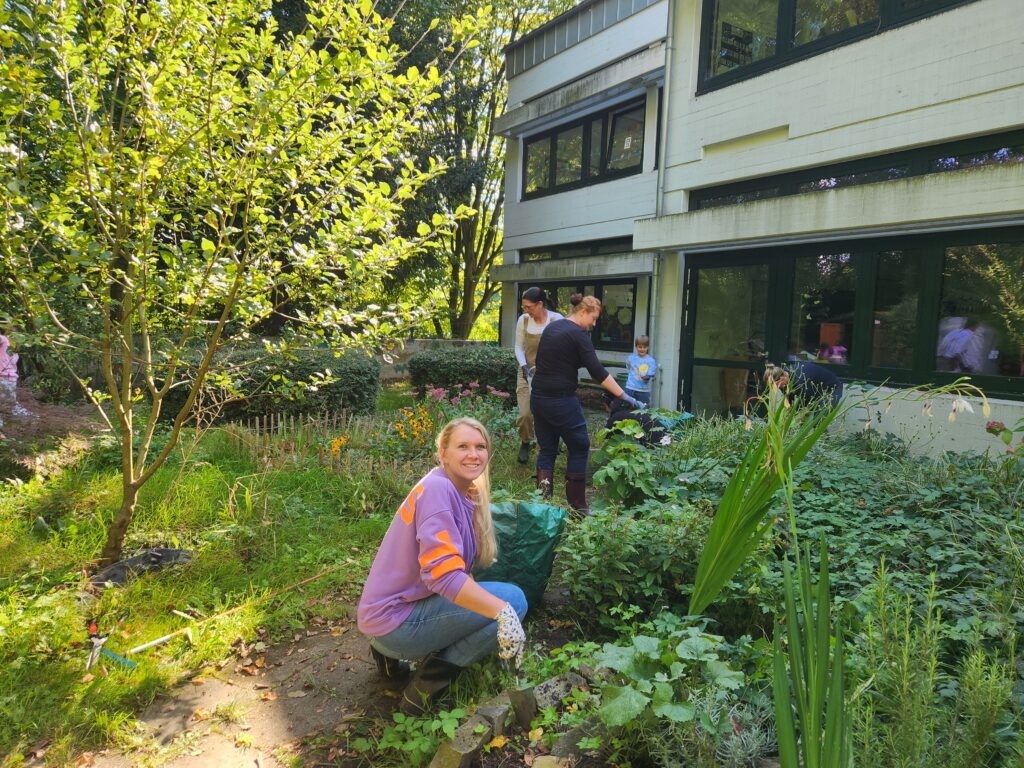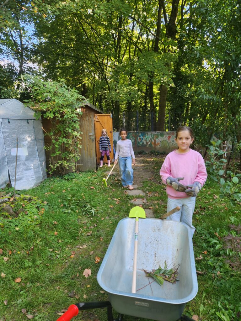 Engagierte Eltern mit ihren fleißigen Kindern haben an einem Freitagnachmittag den Klimagarten herbstfest gemacht.